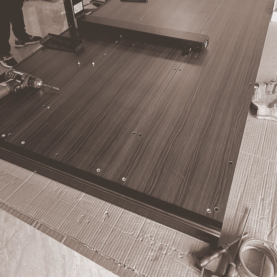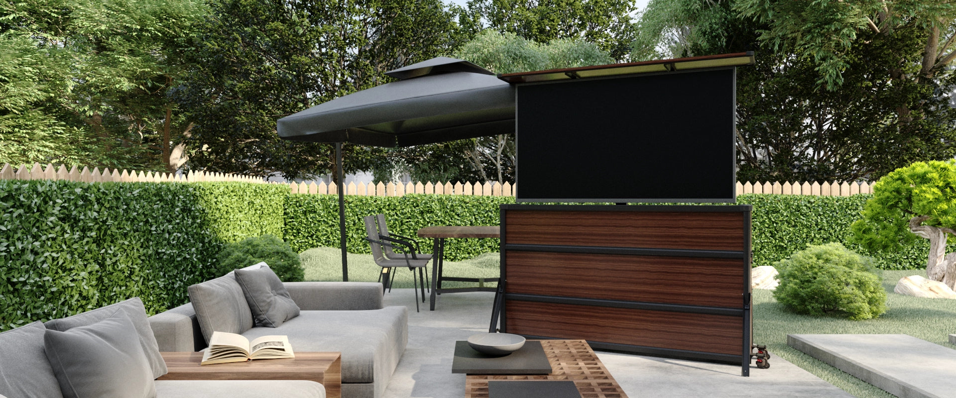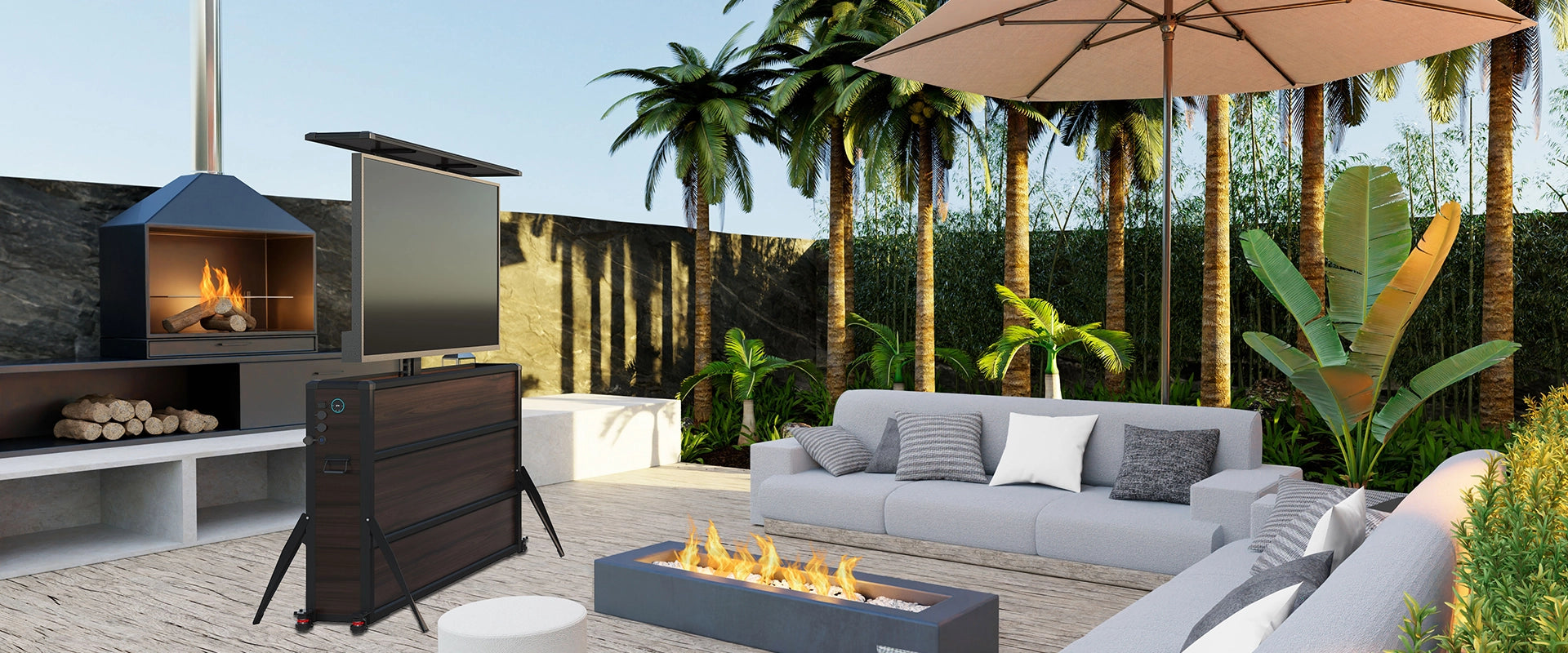 Our outdoor tv lift cabinet blends durability and elegance for exceptional outdoor entertainment. Built with a lightweight aluminum alloy cavity, this tv lift cabinet ensures strength without bulk. Its weather-resistant thermos transfer imitation wood grain finish delivers style and resilience, resisting rust and fading for at least five years under full sunlight. At just 124 pounds for the 65-inch model, this tv lift cabinet outdoor is the lightest in its class. Equipped with Foot Master wheels, the motorized tv lift cabinet moves easily and locks securely. Four support arms, inspired by Falcon 9’s landing, provide stability. Customizable to your needs, this tv cabinet with lift elevates your outdoor experience.