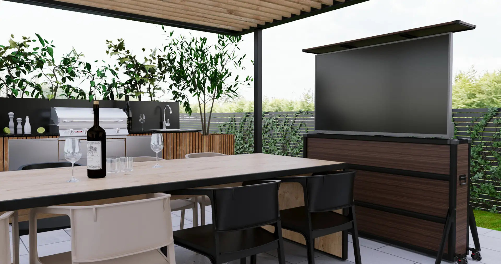 Handcrafted with precision and built for all-weather durability, this smart lift TV cabinet transforms outdoor dining, BBQs, and poolside fun into seamless, elevated entertainment experiences.